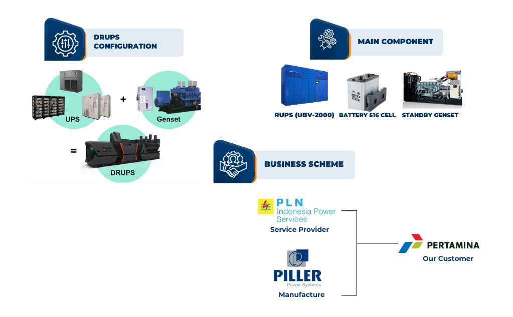 DIESEL ROTARY UPS (DRUPS) Layanan menggabungkan fungsionalitas UPS bertenaga baterai atau roda gila dan generator diesel. Ketika pasokan listrik utama gagal, energi yang tersimpan di roda gila elektro-mekanis dilepaskan untuk menggerakkan generator listrik, yang terus memasok daya tanpa gangguan.